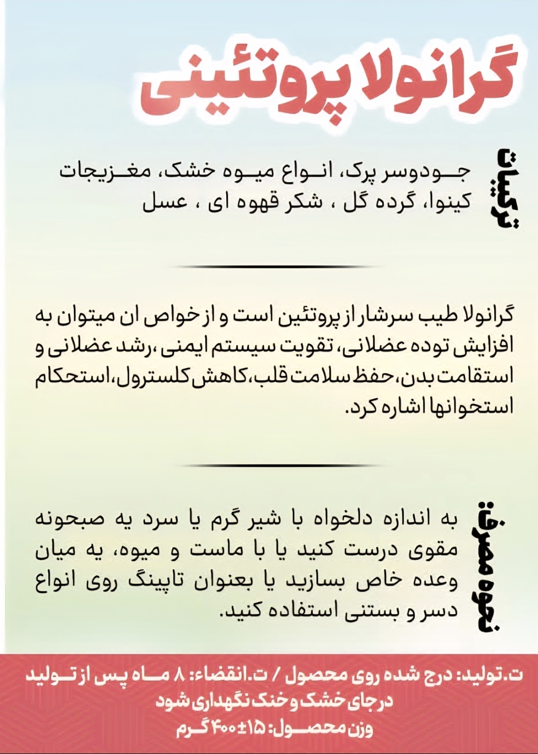گرانولا پروتئینی ۳۸۲,۰۰۰ تومان افزودن به سبد خرید نظرات هنوز نظری ثبت نشده اولین نفری باشید که نظر میدهید ثبت نظر نظر شما راجع به این محصول چیست؟ گرانولا پروتئینی چه امتیازی به این محصول میدهید. ★ ★ ★ ★ ★ نام شما عنوان نظر شما متن نظر شما